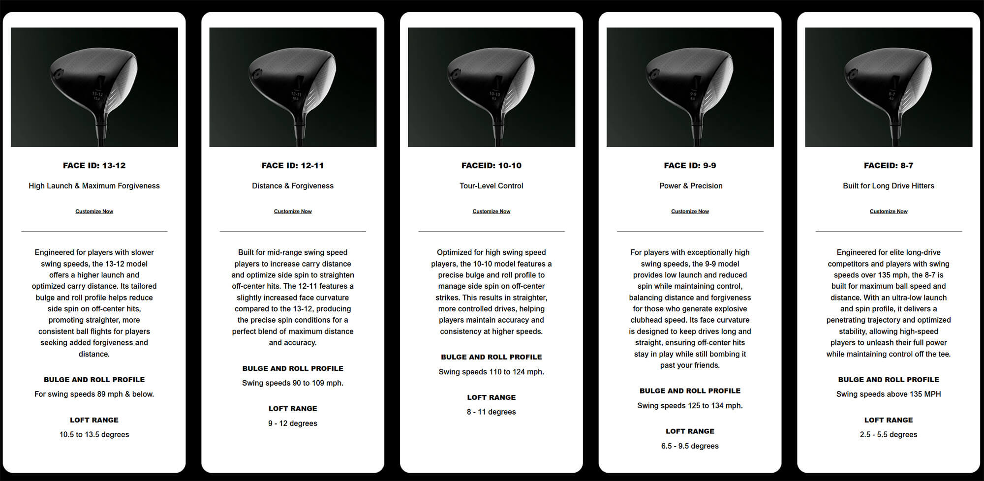 스윙스피드의 맞는 5가지 모델들을 소개하며, 각 모델에 맞는 샤프트를 추천해줍니다. 각 모델은 각기 다른 곡률을 가진 페이스를 탑재해서 공이 바르게 날아갈 수 있게 도와준다고 설명하고 있습니다. 이는 디셈보의 철학과 같습니다.