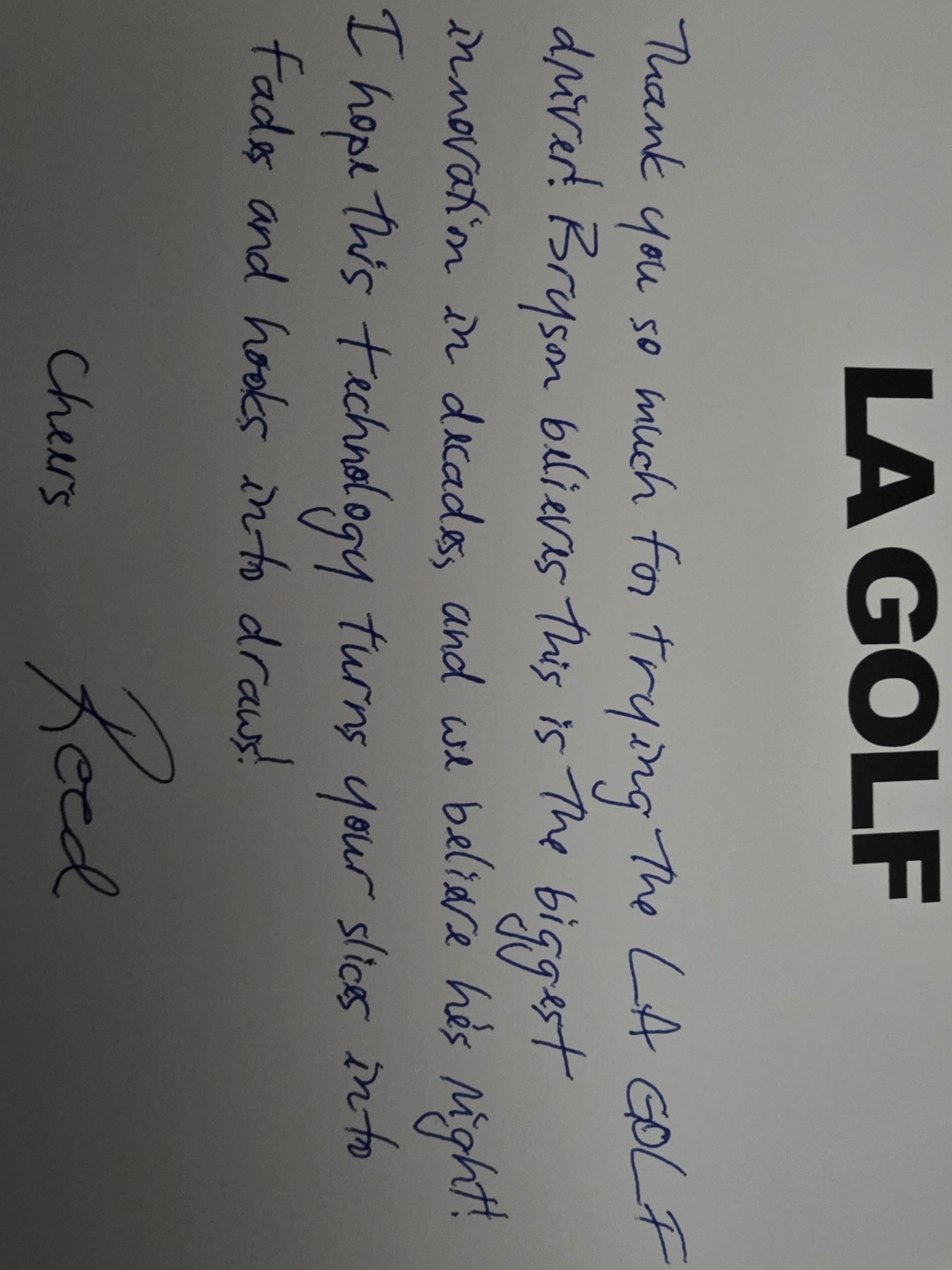 우선 제품을 받아보니 제품을 제작한 엔지니어로 보이는 분의 자필 편지까지 들어있는데 "LA골프의 기술이 슬라이스를 페이드로, 훅을 드로우로 바뀌길 바란다"라는 내용이 아주 기분이 좋네요. 신문지처럼 제작한 제품 소개서도 굉장히 신선했습니다. 제품 마케터의 아기자기함이 느껴지는 부분입니다.