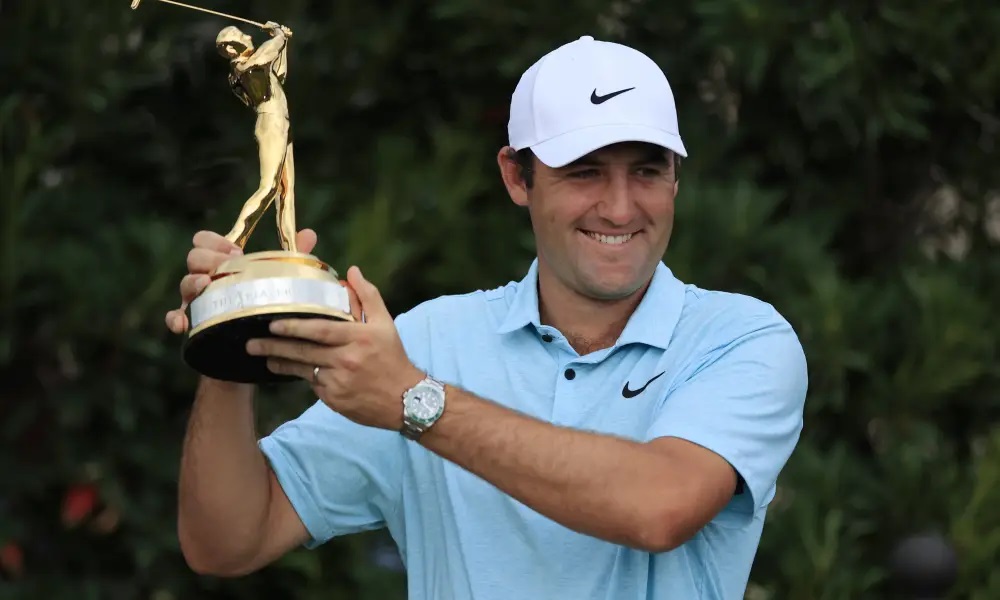 스코티 셰플러가 더 플레이어스 챔피언쉽 우승컵을 들고 있다, golfweek 발췌