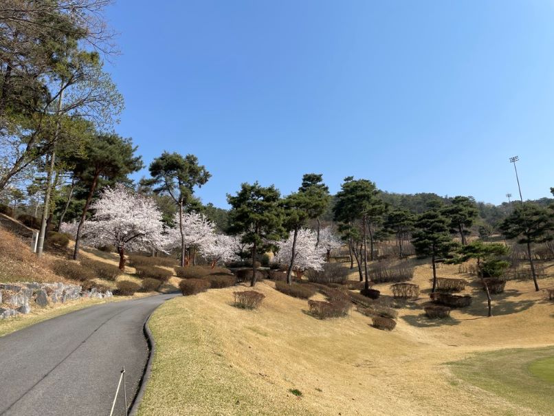 스타팅하우스 앞부터 벚꽃이 만개해 있는 모습입니다. 일년에 딱 2~3주간 볼 수 있는 골프장의 모습이니 이때는 꼭 라운드를 잡는 편입니다.