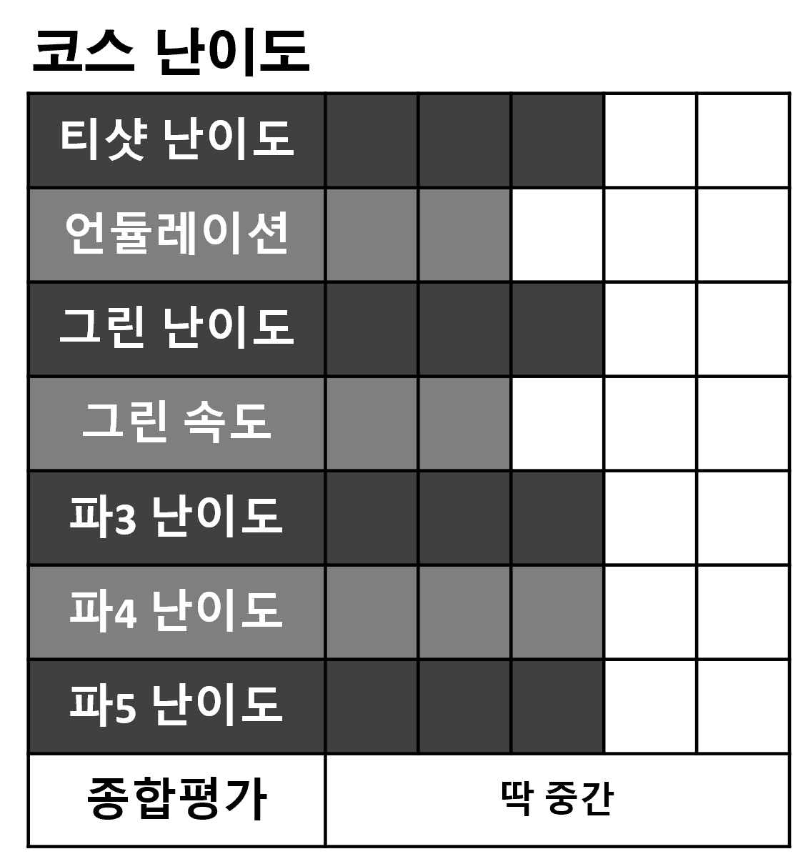 코스의 난이도 또한 적당히 넓은 페어웨이와 좁은 페어웨이가 섞여있었고, 아일랜드 홀, 개미허리, 도그렉 등이 포함된 코스도 간간히 있어 코스매니지먼트도 가능했습니다.